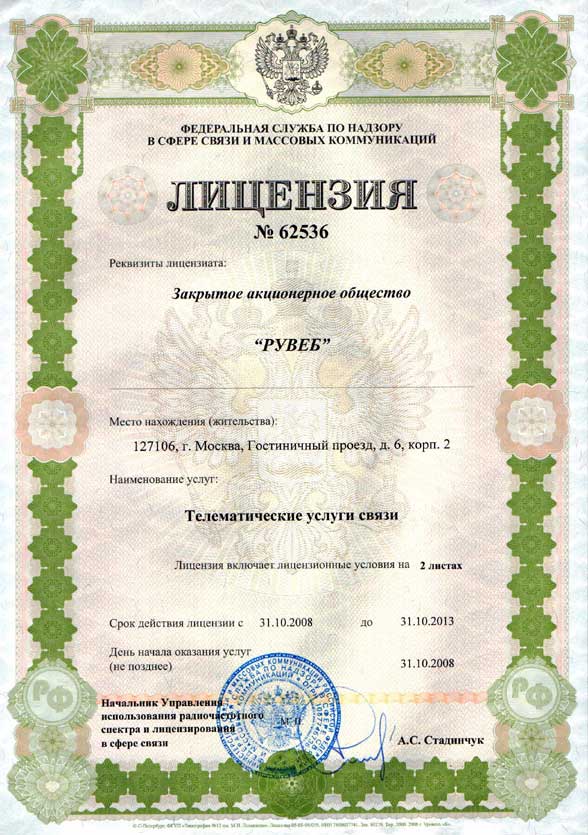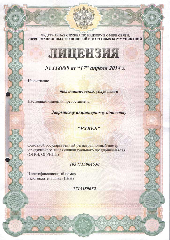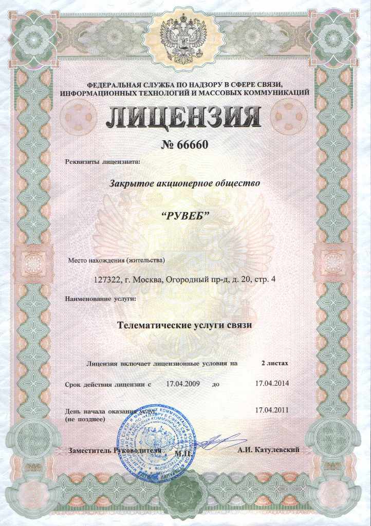 Лицензия Минсвязи РФ: № 118088 от 17.04.2014 (старые лицензии 28411 от 31.10.2003, 62536 от 31.10.2008 № 66660 от 17.04.2009)